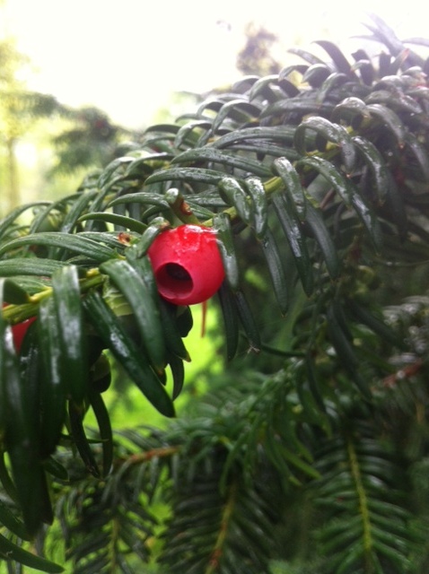 Gister liep ik met de hond in het buurtpark en kwam langs een naaldboom met rode bessen. Wat leuk, dacht ik, een naaldboom die bessen heeft. Nu ben ik nogal bezig met het uitproberen van alles wat eetbaar is in de natuur, dus ik plukte zo'n bes en likte eraan. Meteen schoot me te binnen dat de boom met de bessen een taxus moest zijn, een giftige boom. (Tijdens het schrijven van mijn 'Rondjes Groen door het Oude Westen' afgelopen jaar was ik erachter gekomen dat een paard na het eten van snoeiafval met daarin taxusnaalden al binnen vijf minuten dood kan neervallen.)